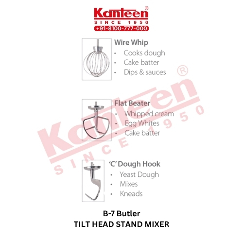The Butler B-7 stand mixer has a 325-watt motor, 7.5 litre stainless steel bowl with an ergonomic handle, a pouring shield and a tilt-back mixer head design that provides easy access to the bowl and beaters.